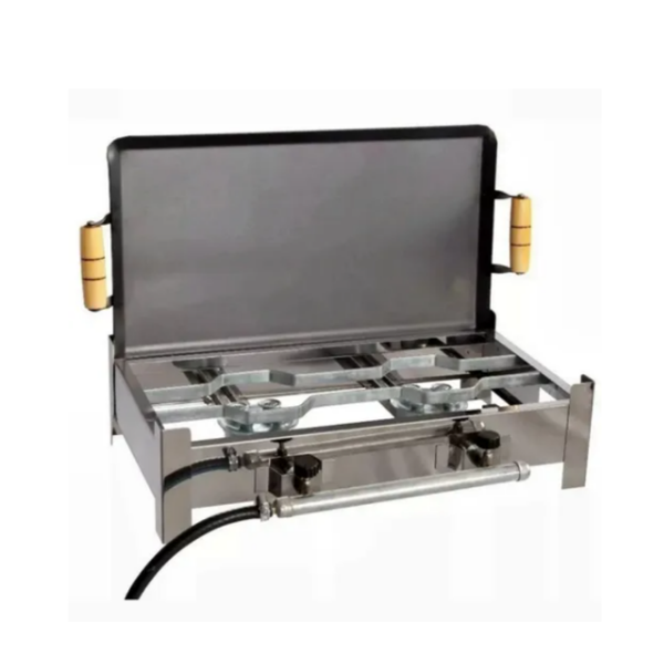 Equipado com dois registros individuais para controlar as chamas. Produto de fácil manuseio e transporte. Ideal para fazer Carnes Grelhadas, Bifes, Legumes em Geral; Tendo a Possibilidade também de preparar Cachorro Quentes e Lanches. Se Precisar, pode retirar a chapa de cima e usar apenas como um fogão de 2 bocas