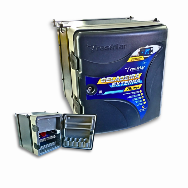 Uma evolução da clássica Geladeira Externa da Resfriar. Agora com 75 Litros, novo design, display digital e um melhor aproveitamento interno. Conta com um exclusivo porta latas, sistema de vedação contra poeira e água, tecnologia resistente à trepidação da estrada e função turbo para rápido resfriamento com temporizador de desligamento automático. Rápido resfriamento com temporizador de desligamento automático de 1 hora ou até atingir a temperatura desejada